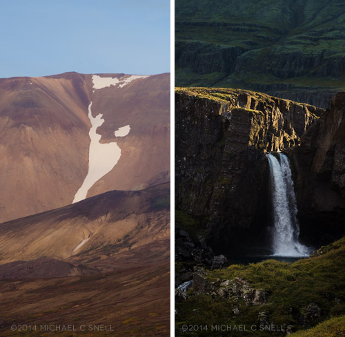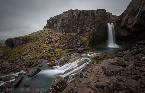 As you drop into the fjord valley, the road parallels a river that drops over a series of waterfalls. Perhaps the largest — that you can see from the road, anyway — is Gufufoss. There’s a small turnout near the falls so I parked the Tiguan and walked to the falls, through a small group of sheep that were far to focussed on grazing to worry about me. The sun had not yet topped the ridge so I began shooting the falls while they were in full shade: