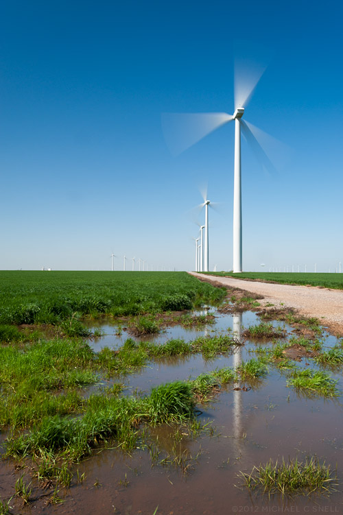 The shot above was taken at a new wind farm being built near Spearville, Kansas. The sky was deep enough blue that I thought I might be able to get a little blur on the blades by using my ND filter. At faster shutter speeds, the blades are crisp and you can’t tell whether they are turning or not. A little blur seemed important for showing the turbines in action and in speaking to the energy that they create. In the end, I stacked both my ND filter and my polarizer on my 17-35 in order to cut out enough light to lower the shutter speed down to 0.4 seconds. Just enough to do the trick.