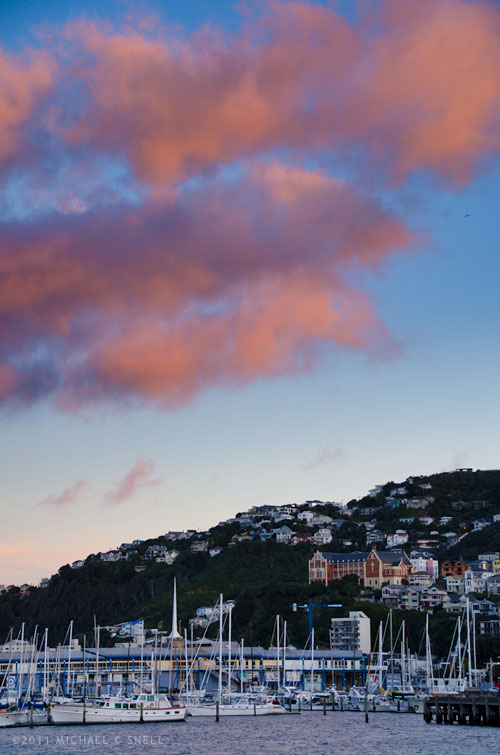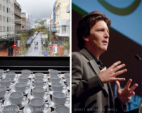 The shot on the left sums up much of my time in Wellington — I saw glimpses of the city through windows as I passed from meeting room to meeting room. These coffee cups were set up for the attendees of my Freelance Council meeting one morning and I was somewhat relieved to see the rain outside as I felt that I maybe wasn’t missing quite so much that day afterall. On the right is a quick shot of Andrew McCarthy, actor-turned-travelwriter, who was our keynote speaker at the first day’s lunch. The shot at the top of this post was made at a reception the night before. I had taken a camera — just in case — and was relieved to see that one side of our venue opened to the waterfront when a beautiful sunset appeared. I missed out on some hors d’oeuvres that evening, but got a few nice shots.