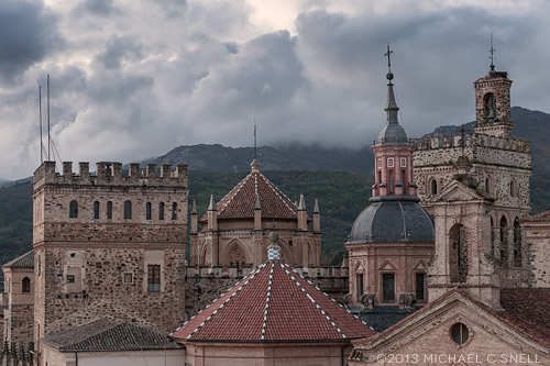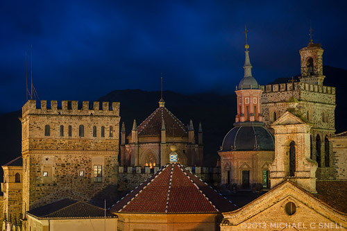 One last shot of the monastery just before sunrise with the main courtyard of the Parador seen in the foreground. Once the sun broke over the mountains, the light was actually a little too harsh for my taste and several of the towers were casting harsh shadows on one another. It was time to pack up the gear anyway before grabbing a quick breakfast and heading off to our next stop: Merida, Spain.