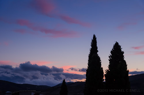 I settled on this view (above) with my full-frame Nikon D700 and locked it down on the tripod to get a series of shots as the light changed. I was hoping that, at some point, some exterior lighting might come on to contrast with the cobalt blue skies that I expected just after sunset. The sun was actually going down to the left of this scene so, while my one camera body was occupied with the monastery, I shot variations of the sunset itself with my D7000: